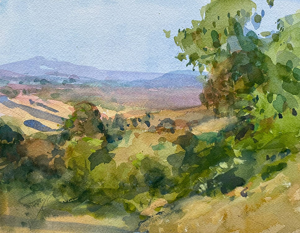 The overall mood is tranquil, with delicate, translucent layers of watercolor emphasizing the fleeting beauty of the evening light.