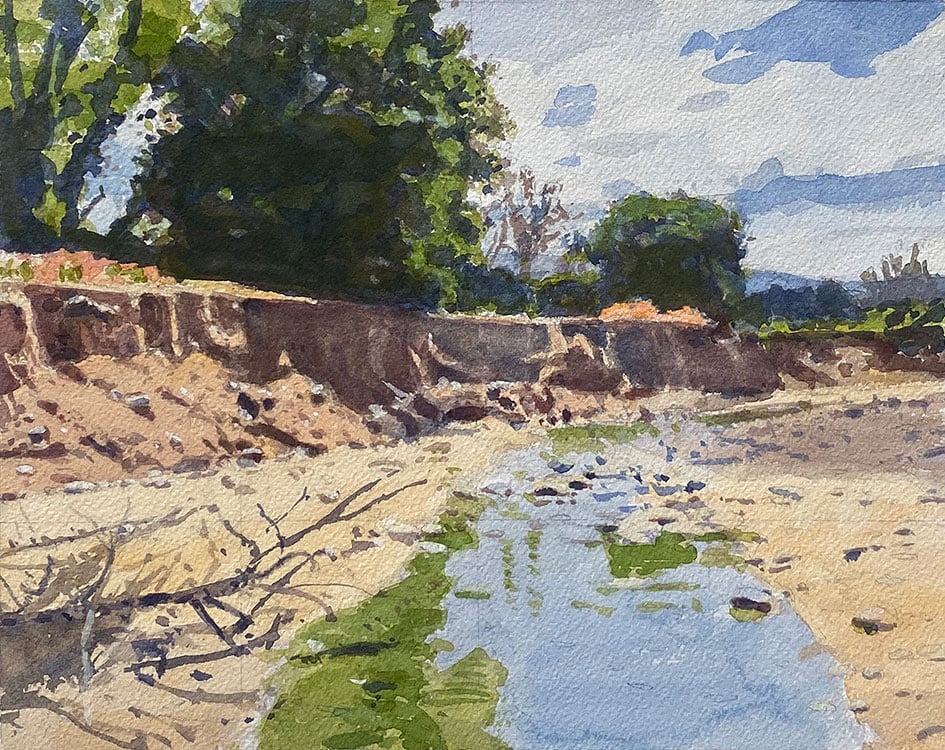 This watercolor painting, 8x10 inches, painted on Arches, cold pressed, 140lb, unframed, depicts a serene landscape along the Bell Canyon in San Juan Capistrano, where tall Sycamore and Oak trees line the arroyo's edge. The scene is framed by rolling hills in the background. The overall effect is a tranquil, harmonious blend of nature's colors and textures, captured with the fluid, translucent quality of watercolor.