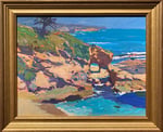 The painting captures the rugged majesty of a cliff in South Laguna Beach, California, a region celebrated for its breathtaking coastline and vibrant art scene. Rendered in the plein air style, characteristic of Laguna’s historic art colony, the artwork is an acrylic on cradled wood panel, measuring 16 x 20 inches, with vivid colors and impressionistic brushstrokes that evoke the interplay of light and nature.